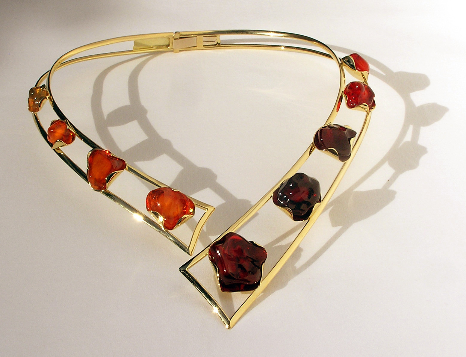 Descripción de materiales utilizados: 81,50 gr. de oro amarillo de 1ª ley. Ópalos de fuego tallados de forma irregular sin facetas. Estos ópalos presentan una gradación de color del rojo al anaranjado y tienen una característica común: en su interior se observa una pequeña cavidad a modo de esfera de un color blanquecino y que generalmente contiene agua debido a la falta de cristalización de esa parte del gel de sílice. El nombre comercial dado en Méjico a estas gemas con dicha característica es de “HUEVITOS”, debido al color y forma que tienen estas alteraciones dentro del ópalo.
